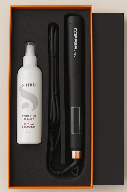 La nueva plancha COPPER 3.6 en color **Black** combina elegancia, tecnología y resultados profesionales. Gracias a su calentamiento ultrarrápido y placas de titanio, lograrás un alisado sedoso, duradero y sin frizz en minutos.