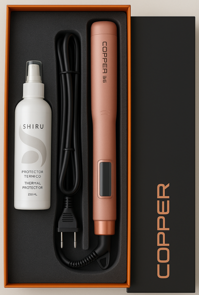 La nueva plancha COPPER 3.6 en color **Mokka Mousse** combina elegancia, tecnología y resultados profesionales. Gracias a su calentamiento ultrarrápido y placas de titanio, lograrás un alisado sedoso, duradero y sin frizz en minutos.